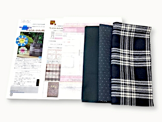 | ・生地A(表布)タータンチェック(ウー ル)1枚 ・生地B(内布)ダイヤ柄銀ラメドット模様(エステルウール)1枚 ・生地C(表布底 持ち手) 無地(綿)1枚 ・型紙プリント接着芯 5枚 ・ブランドネーム 1枚 ・作り方説明書 |