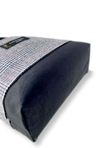 | ・生地A(表布)タータンチェック(ウー ル)1枚 ・生地B(内布)ダイヤ柄銀ラメドット模様(エステルウール)1枚 ・生地C(表布底 持ち手) 無地(綿)1枚 ・型紙プリント接着芯 5枚 ・ブランドネーム 1枚 ・作り方説明書 |