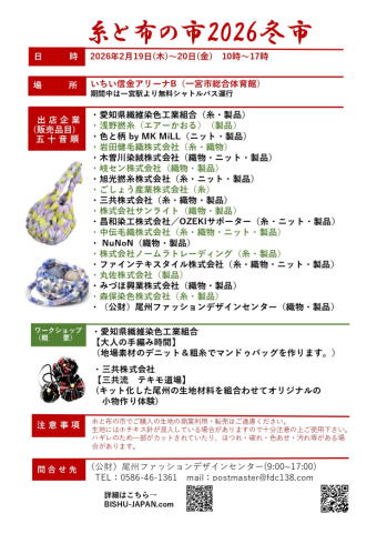 開催時間:10時00分〜17時00分 開催場所:いちい信金アリーナB (一宮市総合体育館) 期間中は一宮駅より無料シャトルバス運行 注意事項:布の市でご購入の生地の商業利用・転売はご遠慮ください。 生地には、ホチキス針が混入している場合がありますので、十分注意の上ご使用下さい。 ハギレのため一部がカットされていたり、ほつれ・破れ・色あせ・汚れがある場合があります。 |
