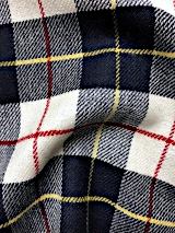 当社オリジナルの生地です。ウール素材のタータンチェック柄で、経糸に毛羽が少なく、滑らかで光沢感のあるウール100%の梳毛糸を、よこ糸に毛羽立ちがあり、ふわふわしていて保湿性が高く、環境を意識した再生ウールの毛七(ウール70%)の紡毛糸を使用しております。柔らかく優しい風合いをしています。柄も豊富で、19種類あります。