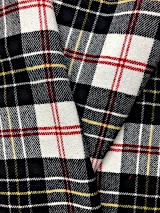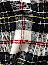 当社オリジナルの生地です。ウール素材のタータンチェック柄で、経糸に毛羽が少なく、滑らかで光沢感のあるウール100%の梳毛糸を、よこ糸に毛羽立ちがあり、ふわふわしていて保湿性が高く、環境を意識した再生ウールの毛七(ウール70%)の紡毛糸を使用しております。柔らかく優しい風合いをしています。柄も豊富で、19種類あります。