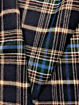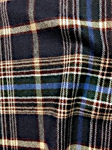 当社オリジナルの生地です。ウール素材のタータンチェック柄で、経糸に毛羽が少なく、滑らかで光沢感のあるウール100%の梳毛糸を、よこ糸に毛羽立ちがあり、ふわふわしていて保湿性が高く、環境を意識した再生ウールの毛七(ウール70%)の紡毛糸を使用しております。柔らかく優しい風合いをしています。柄も豊富で、19種類あります。