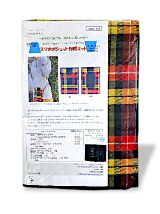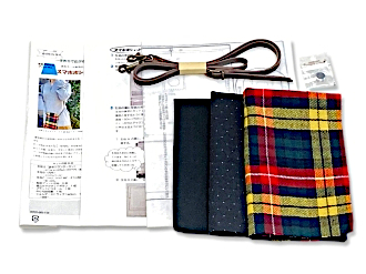 | ・生地A(表布)タータンチェック (ウー ル)1枚 ・生地B(内布)ダイヤ柄銀ラメドット模様(エステルウール) 1枚 ・生地C(フラップ・ストラップホルダー ポケット用布)無地(綿)1枚 ・型紙プリント接着芯 2枚 ・マグネットボタン 1個 ・ブランドネーム 1枚 ・ショルダーストラップ 1個 ・作り方説明書 |