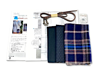 | ・生地A(表布)タータンチェック (ウー ル)1枚 ・生地B(内布)ダイヤ柄銀ラメドット模様(エステルウール) 1枚 ・生地C(フラップ・ストラップホルダー ポケット用布)無地(綿)1枚 ・型紙プリント接着芯 2枚 ・マグネットボタン 1個 ・ブランドネーム 1枚 ・ショルダーストラップ 1個 ・作り方説明書 |